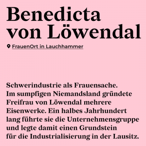 Nicht erst seit kurzem machen Löwen in Brandenburg von sich reden. Beim heutigen #FrauenOrteFreitag geht’s nicht nach Kleinmachnow, sondern in die Lausitz. Wir werfen einen Blick in die Geschichte der Industrialisierung in Brandenburg und widmen uns Freifrau von Löwendal, welche bereits im 18. Jahrhundert eindrucksvoll bewies: Schwerindustrie ist ebenso Frauensache!