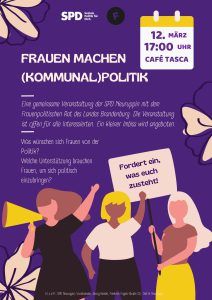 Was wünschen sich Frauen von der Politik? Welche Unterstützung brauchen Frauen, um sich politisch einzubringen?Wir möchten uns austauschen über Frauen in der Kommunalpolitik. In gemütlicher Atmosphäre im Café Tasca am 12. März um 17:00.