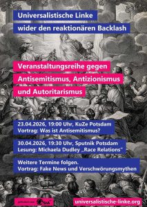 Im Rahmen der KriSe (Kritischer Semesterstart Sommersemester 2026) läd das KuZe zum Auftakt der "Veranstaltungsreihe gegen Antisemitismus, Antizionismus und Autoritarismus" ein. Diese wird von der Universalistischen Linken Potsdam organisiert und gefördert durch den ASTA - UP. Gestartet wird mit dem Thema: