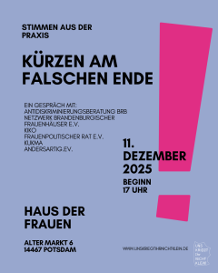 Die Pressemitteilungen über finanzielle Kürzungen von Vereinen und Organisationen , die sich in Brandenburg gegen Diskriminierung und für Gleichstellung einsetzen, häufen sich Tag für Tag und hinterlassen große Fragezeichen und Unmut. Dem wollen wir entgegenwirken und darüber mit den Akteuer*innen ins Gespräch gehen. Wir laden euch dazu ein bei dem Podiumsgespräch einen Überblick zu erhalten, Fragen zu stellen und in den Austausch zu gehen.