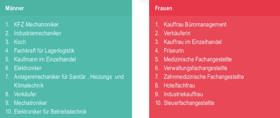 In Brandenburg gibt es etwa 270 verschiedene Ausbildungsberufe. Die Berufswahl von fast der Hälfte der Mädchen* in Brandenburg fällt allerdings auf nur zehn Berufe; vor allem „typische Frauenberufe“, die schlechter bezahlt sind und die geringere Aufstiegsmöglichkeiten bieten.